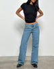 Our Parallel jeans, in blue stone wash, feature a low rise fit with a straight leg, 5 pockets, branded back tab, branded button and rivets. Style with our Sakha tee.
