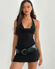 The Pramita mini dress in a black jersey material, featuring a plunge cowl neckline. Complete with halterneck and slinky ruching - establishing a flattering bodycon fit.